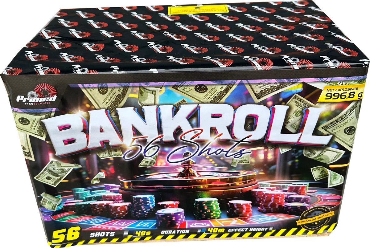 Bankroll by Primed Pyrotechnics is a 54-shot F3 compound cake with 30mm tubes and almost 1kg NEC.