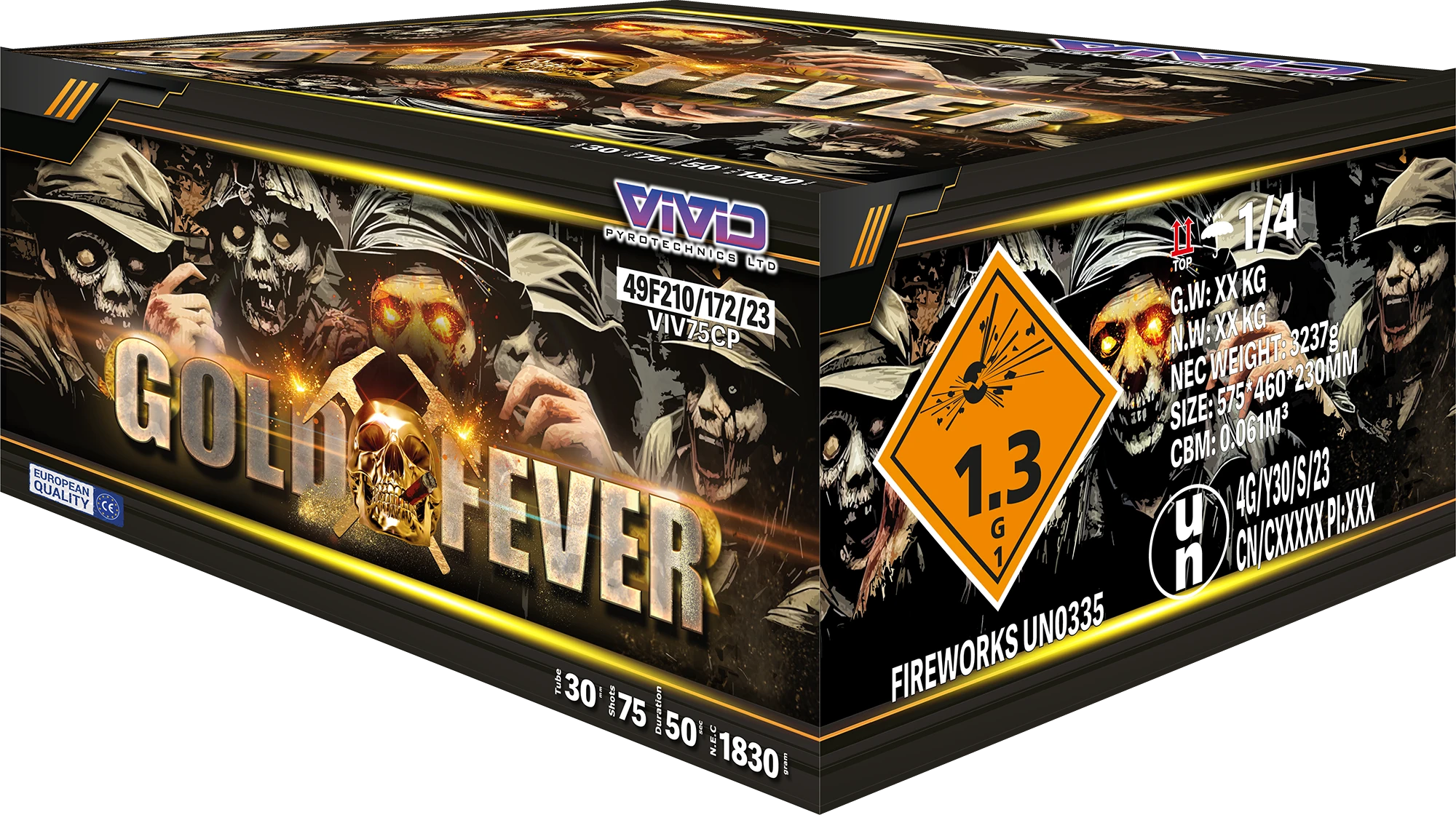Gold Fever it is. If you’re looking for the ultimate gold finale then this is the barrage for you. Straight firing gold brocade tails to huge golden glitter brocades then alternating to fanned bursts of gold tails to gold brocades with gold glitter stars. This is repeated several times before the finale adds the addition of gold flitter mines. Simply stunning.
