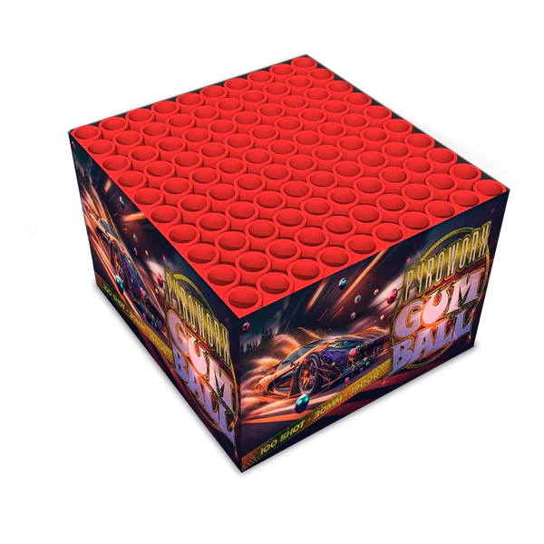Gumball is a 100-shot compound firework delivering bold effects and breathtaking finales. With 30mm bore tubes, 1900g of powder, and vivid colours like red, blue, and pink